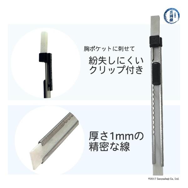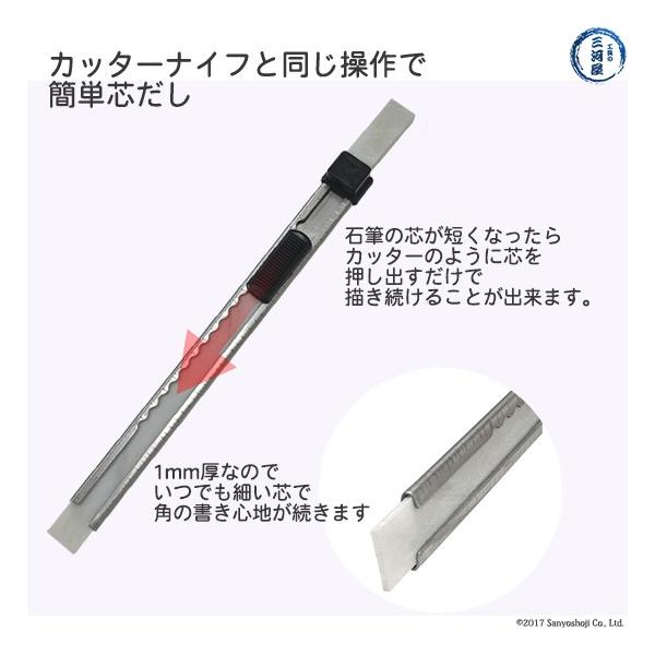カッターナイフに似た形状で、本体(ペンホルダー)から細い芯(1mm厚の石筆)を押し出すことができるため、 途中で磨くことなくいつまでも細い形状の線で、精密なケガキ作業をすることが可能です。