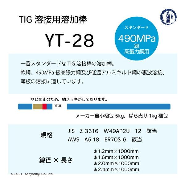 TIG溶接用溶加棒 YT-28 φ1.6mm×1000mm ばら売り1kg 鉄用 日鉄溶接工業 (旧:日鉄住金溶接工業 NSSW)は、日鉄溶接工業の一般的な鉄(軟鋼)490MPa級高張力鋼の裏波溶接及び薄板溶接に適したTIG溶接用の溶加棒です。