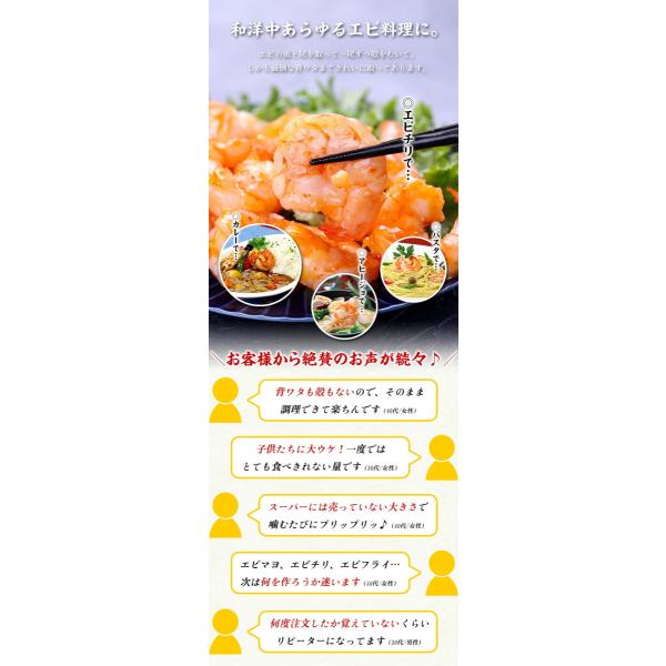 今回は新鮮な活原料を1尾ずつ丁寧に殻をむき、背中に切れ目を入れて背ワタを取る「バタフライカット」と呼ばれる特殊加工をしてありますので下ごしらえ不要で調理が簡単です。食べ応え抜群の特大サイズを厳選していて、1尾ずつバラ凍結されており、使いたい分だけ解凍できますので、下処理なしですぐに調理できる優れものです。エビマヨ、エビチリ、エビフライ、野菜炒め…ボリューム満点たっぷり1キロのお得な業務用パックでお届けしますので、ご家庭でいろんなエビ料理を存分にお楽しみください。