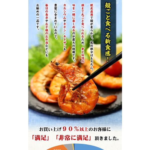 商品のポイント:殻をむく必要のない食べやすさ、独特の柔らかな食感、身と味噌の絶妙な風味、下ごしらえ不要の便利さなど、通常の商品とは違った魅力がいっぱいで、当店での販売状況&リピート率からも、その人気の高さが伺えます。脱皮直後で殻が柔らかく尾の部分はもちろん、頭のまで丸ごと食べられるため、身と味噌の味を一緒に楽しめるのが最大の特徴です。カルシウムやキチン・キトサンも豊富に含まれているので、毎日の食卓やお子様のお弁当などにもお勧めの一品です。