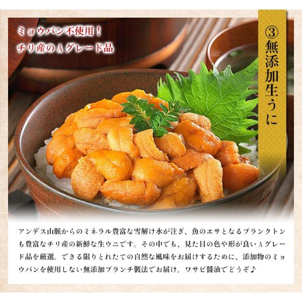 そして3品目は、ミョウバン不使用の無添加生ウニ!海産資源豊富なチリ産の新鮮な生ウニを、無添加ブランチ製法により美味しさそのまま急速冷凍しました。