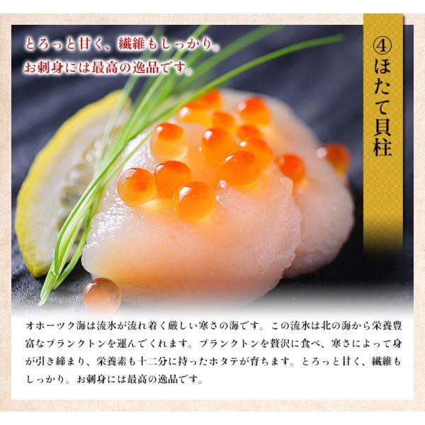 そして4品目は、北海道産の生ホタテ貝柱!極寒のオホーツク海で育った極上のホタテはとろっと甘く、繊維もしっかり。お刺身には最高の逸品です。
