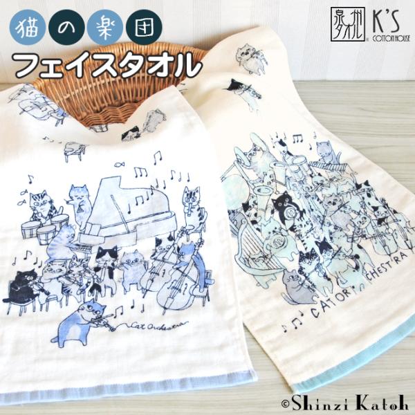 フェイスタオル 猫柄 音楽柄 楽器 日本製 綿100% レディース かわいい プレゼント Shinzi katoh 猫の楽団 約30×80cm ガーゼ シンジカトウ 泉州タオル 優