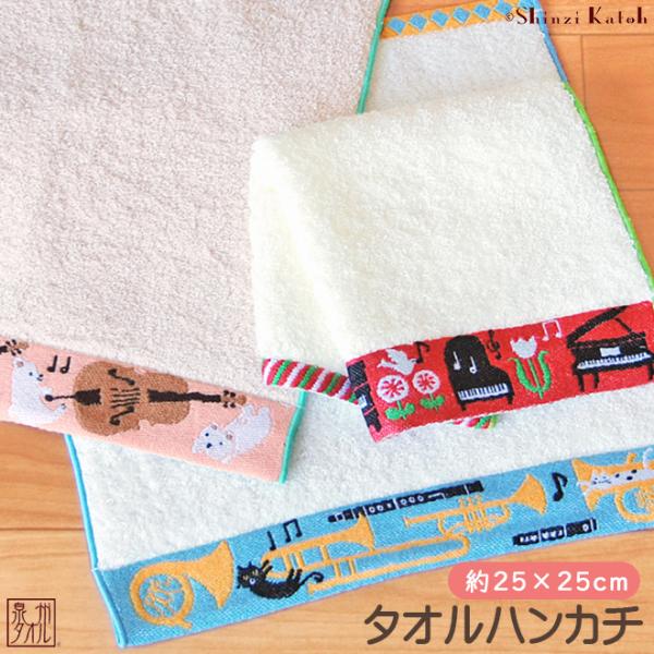 タオルハンカチ 音楽 吹奏楽 かわいい プレゼント 演奏会 発表会 日本製 レディース Shinzi katoh メロディーオーケストラ 約25×25cm ピアノ 猫 優
