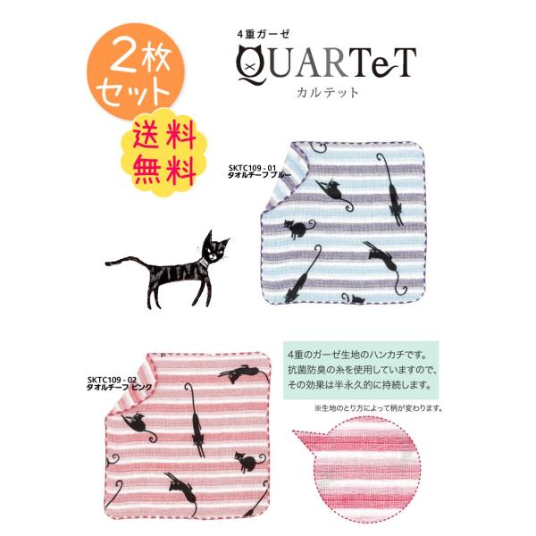 アウトレット価格 ガーゼハンカチ 2枚 セット ねこ ネコ 猫 4重ガーゼ 抗菌 防臭 アウトレット カルテット 約25×25cm Shinzi Katoh 泉州タオル 日本製