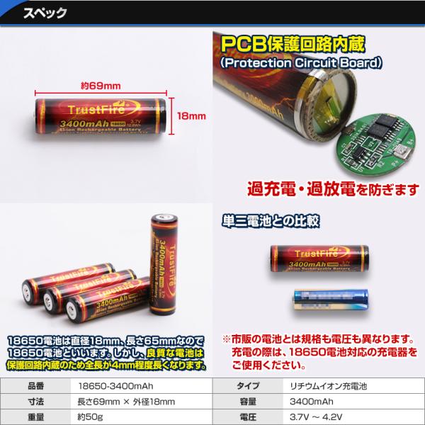 18650 リチウムイオン電池 4本セット 保護回路付き PSE適合品 TrustFire社製 3400mAh 18650電池 バッテリー 懐中電灯 フラッシュライト予備
