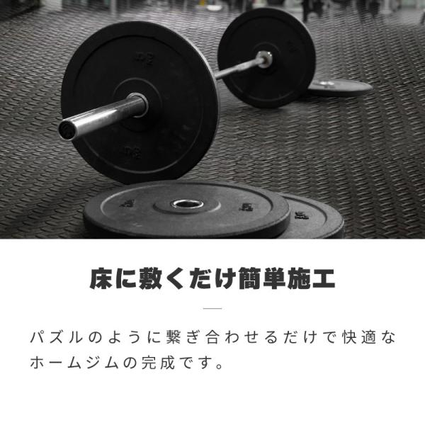 傷や衝撃に強い厚さ1.2cmのジョイント式トレーニングマット。 床をしっかりガードして傷や衝撃から守ります。