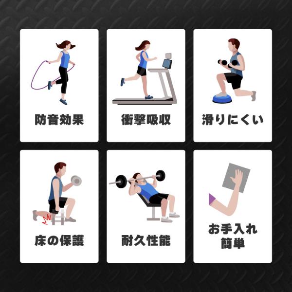 足音やトレーニング機材の動作音を吸収する効果もあり、騒音対策として集合住宅などでの使用もおすすめです。