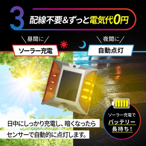 ・昼間に太陽の光でソーラー充電し夜間暗くなると自動で点滅 常時点灯します