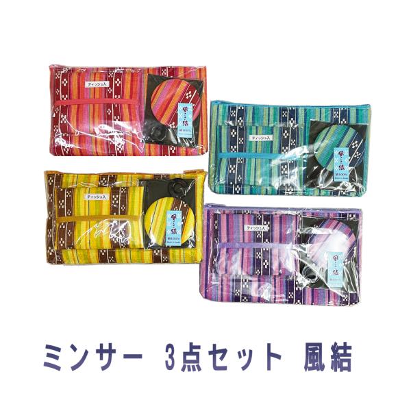 ポーチ ティッシュケース 鏡 雑貨 沖縄 お土産 ミンサー織 プリント 日本製 ミンサー 3点セット 風結