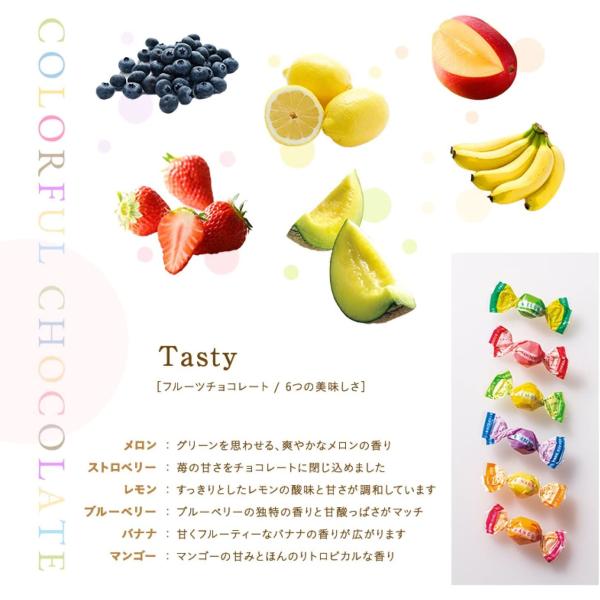 ブルーベリー、ストロベリー、レモン、マンゴー、メロン、バナナの6種類の味が楽しめるフルーツチョコレートです。