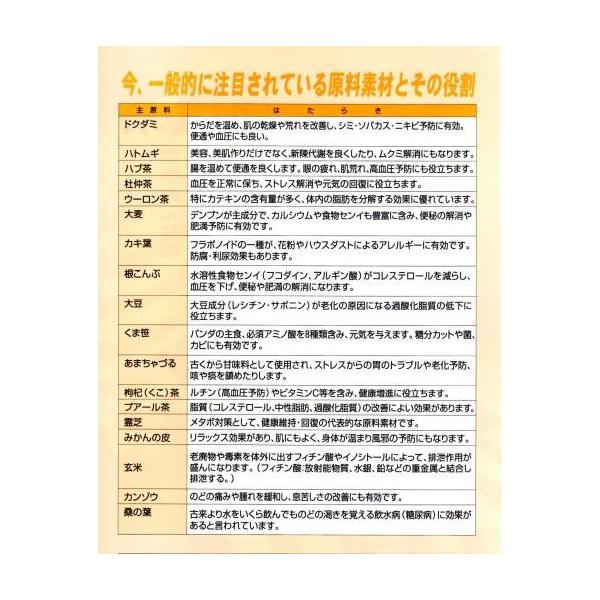 ドクダミ、ハトムギ、ハブ茶、杜仲茶、ウーロン茶、大麦、カキ葉、根こんぶ、大豆、くま笹、あまちゃづる、くこ茶、プアール茶、霊芝、みかんの皮、玄米、カンゾウ、桑の葉、など今、注目されている原料素材で作られています。