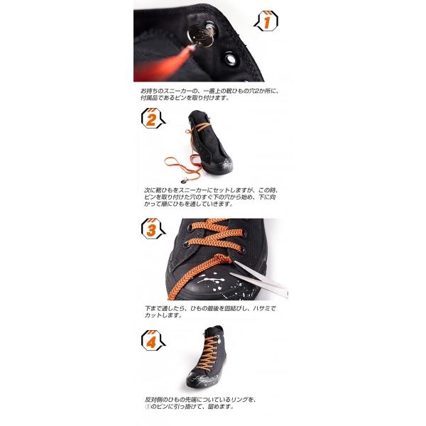 片手で先端のリングを引っ張って、専用ピンに引っ掛けるだけ、【結ばない】【ほどけない】靴ひもです。