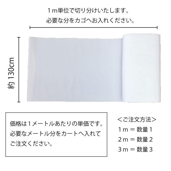 幅が約130cmあり、長さは必要に応じて切り分け致します。1mで小幅の晒(33〜35cm幅)の約3.7m分に相当します。