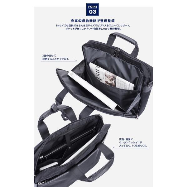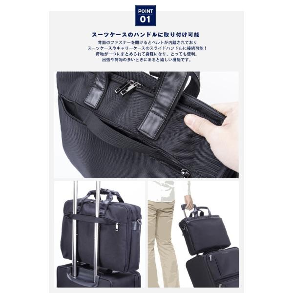 シンプルなビジネスバッグ。ポリエステル製。デザインのアクセントに合皮を使用。ショルダーストラップで肩掛けも可能。背面のファスナーを開けるとベルトがあり、スーツケースに取り付け可能。小物ポケットやペン挿しなど収納機能も充実!A4サイズ収納可能の軽量タイプ!