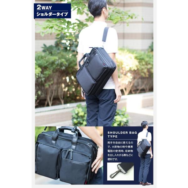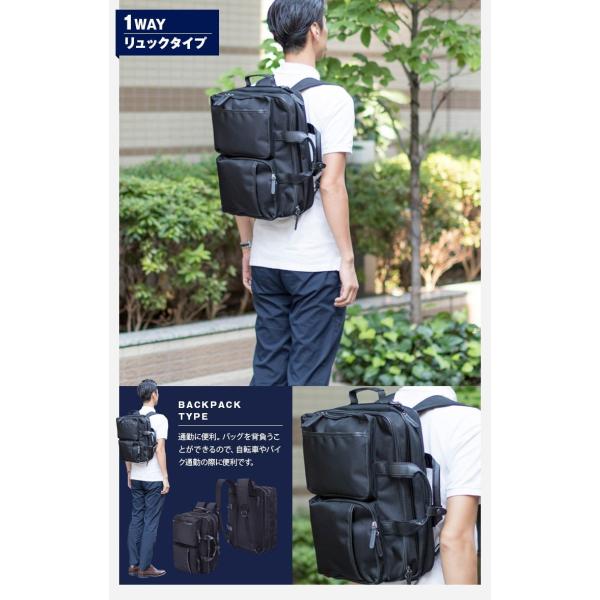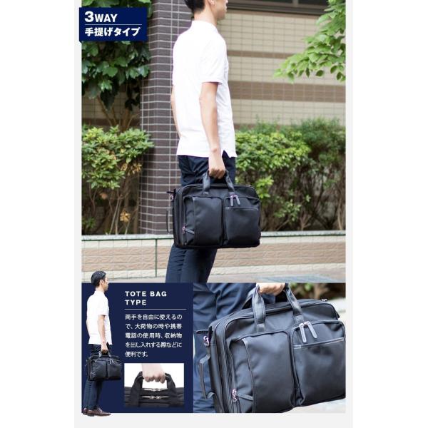 手持ちバッグ・リュックサック・ショルダーバッグとして使える便利な3WAYビジネスバッグ。ポリエステル製。デザインのアクセントに合皮を使用。背面のファスナーを開けるとリュック用のベルトがあります。小物ポケットやペン挿しなど収納機能も充実!B4サイズ収納可能の大きめサイズ。