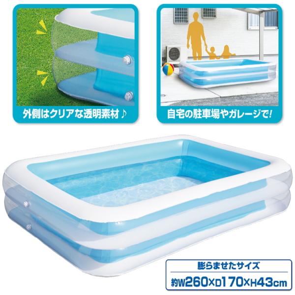 ご注文後のキャンセル・返品・交換不可 ■ブランド:HAC 株式会社ハック■メーカー品番:HAC2-0371■商品名:WIDE ファミリープール 260■主材質:PVC・ABS■サイズ(空気を入れた状態):全体:約W260×D170×H43cm水張りサイズ:約W207×D117×H30cmフチの幅:約20cm■重量:約4.20kg(本体)約4.25kg(箱込)■商品説明:家族みんなで楽しめる広々ワイドなBIGサイズワイドファミリープール!最大幅 約2.6mの家庭用ビニールプールです。外側はクリアな透明素材。自宅の空きスペースやガレージ、駐輪場、庭、玄関周りなどに。※空気入れは別売りとなります。