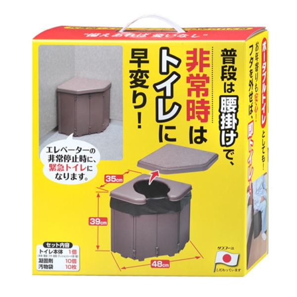 ご注文後のキャンセル・返品・交換不可 お取り寄せ品のため、欠品により商品をご用意出来ない場合がございます。■商品名:ポータブルコーナートイレ■商品サイズ:48×35×40cm■商品重量:2,790g■パッケージサイズ:40.5×37×11cm■パッケージ重量:3,140g■セット内容:トイレ本体×1個、汚物袋×10枚 凝固剤×10個■品質:トイレ本体・便座:ポリプロピレン フタ:ABS樹脂底板:木 (クッションシート)表面:ポリエステル100%裏面:アクリル樹脂(カテキン入り) (凝固剤)高分子ポリマー(汚物袋)ポリエチレン■特長:本体を開いて、底板で固定し、便座とフタをのせることで簡単に組立てできます。 ・折りたたみ式ですので、持ち運びに便利です。(外装箱を収納箱として使用できます。)コーナーに置けるので場所をとりません。約120kgの体重まで支えることができます。室内でポータブルトイレとしても使用できます。汚れた場合は、水洗いできます。(底板は洗えません)凝固剤・汚物袋は10回分をセット。■商品説明:非常時 災害時はもちろん、キャンプなどのアウトドアにもオススメの商品です。男女兼用のため男性用だけでなく女性用としてもおすすめ