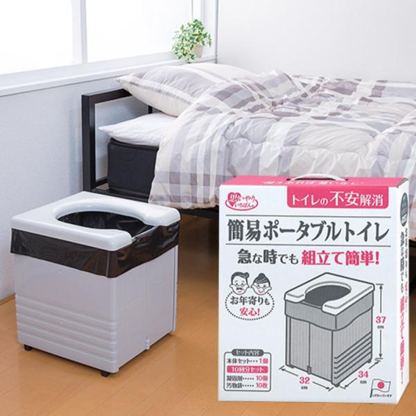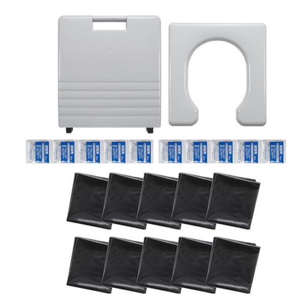 ご注文後のキャンセル・返品・交換不可 お取り寄せ品のため、欠品により商品をご用意出来ない場合がございます。■商品名:簡易ポータブルトイレ■商品サイズ:34×32×37cm■商品重量:2,270g■パッケージサイズ:40×35×9cm■パッケージ重量:2,520g■セット内容:本体セット×1個 汚物袋×10枚 凝固剤×10個■品質:便座・本体・補強板:ポリプロピレン ゴムキャップ:エラストマー凝固剤:高分子ポリマー 汚物袋:ポリエチレン■特長:本体を開いて、補強板で固定し、便座をのせることで簡単に組み立てできます。折りたたみ式ですので持ち運びに便利です。 (外装箱を収納箱として使用できます。)男性でも使用しやすいU型便座にしています。約150kgの体重まで支えることができます。本体にゴムキャップが付いていますので、床を傷めません。汚れた場合は水洗いできます。凝固剤・汚物袋10回分セットしています。凝固剤は約600ccの水分を固めます。室内以外にキャンプなどの野外でも使用できます。■商品説明:非常時 災害時はもちろん、キャンプなどのアウトドアにもオススメの商品です。 男女兼用のため男性用だけでなく女性用としてもおすすめ