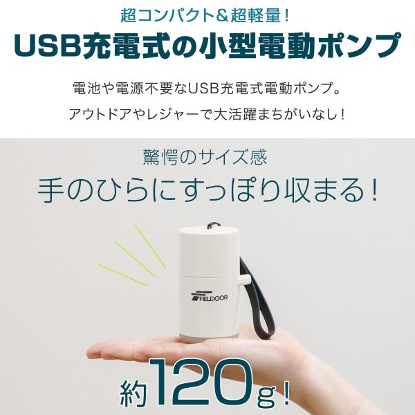 電池や電源不要なUSB充電式電動ポンプ。手のひらサイズで超コンパクト、重量は(約)120g!さらにランタン機能も付いているので、アウトドアやレジャーで大活躍まちがいなし!