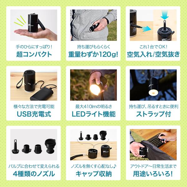 ヤフー1位 電動ポンプ 空気入れ USB充電式 小型 軽量 エアーポンプ LEDランタン バッテリー内蔵 携帯用ポンプ ビニールプール アウトドア 海 送料無料