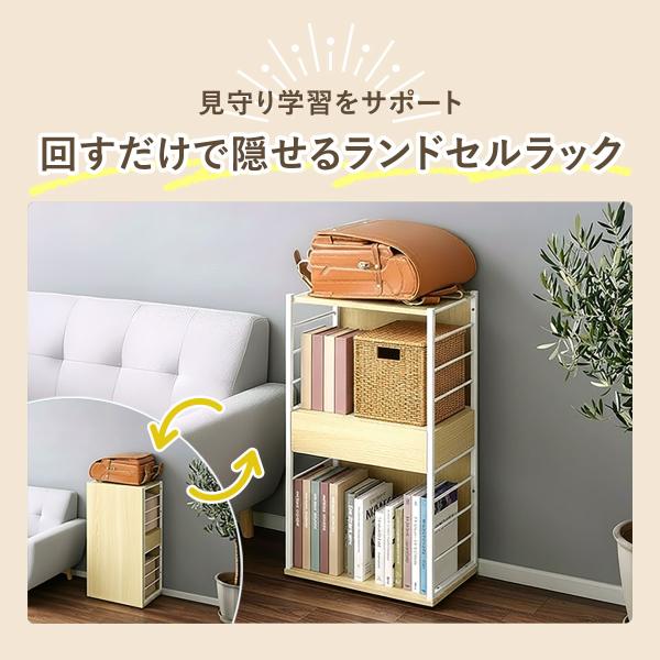 くるっと回すだけで、生活感を隠せるランドセルラック。ランドセルや教材をまとめて収納でき、リビングにもすっきりなじみます。