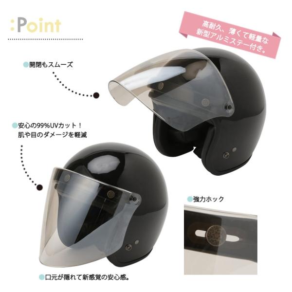 開閉も可能です。汎用式の3点ボタン(ホック)でジェットヘルメットに取付可能。