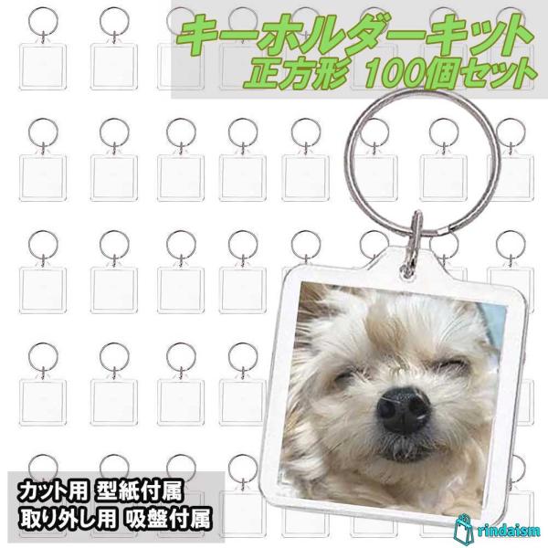 キーホルダー オリジナル キット パーツ 写真 入れ カットテンプレート付 100個 正方形 アクリル フレーム 手作 アクセサリー フォト キーホルダー 作成 rinda