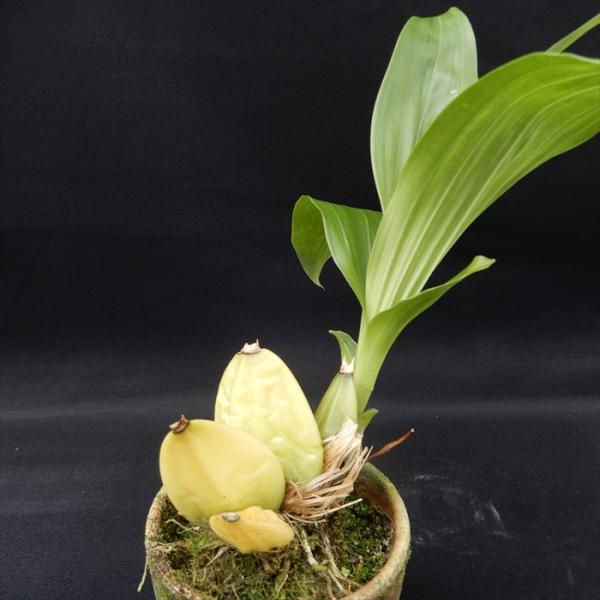 大きな球根状のバルブを地上部にもち、常緑性の大きな葉をバルブの上に展開します。一部の種類は落葉性で、冬になるとすべての葉を落としバルブのみで春まで過ごします。3枚の萼片が大きく発達し、三角形に見える花形が特徴的です。