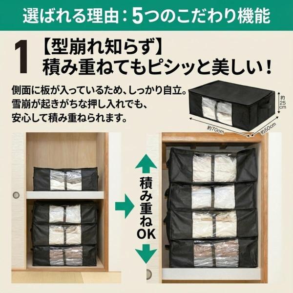 型崩れしにくい安心設計:側面に板が入っているから、布団を入れてもしっかり自立し、積み重ねも安心です。