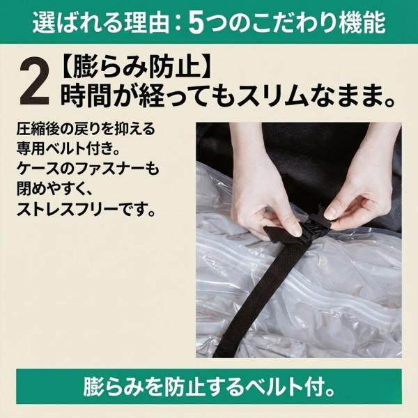 スッキリ収納できるベルト付き:圧縮後のふくらみを防ぐベルトで、ケース内も外見もきれいにまとまります。