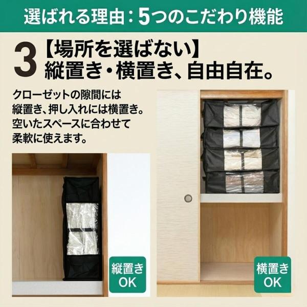 省スペースを有効活用:縦置き・横置きどちらでも使えるので、収納場所を選ばずスッキリ整います。