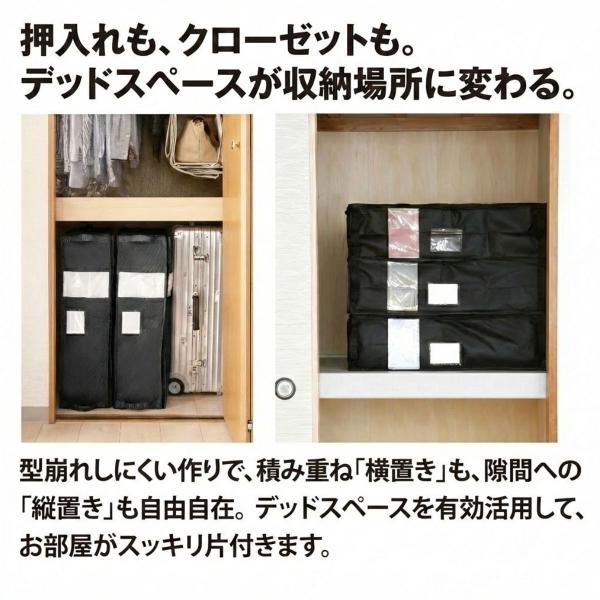 縦置き・横置きどちらもOK:押入れやクローゼットのスペースに合わせて無駄なく配置できます。