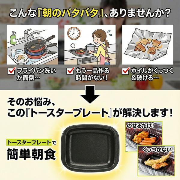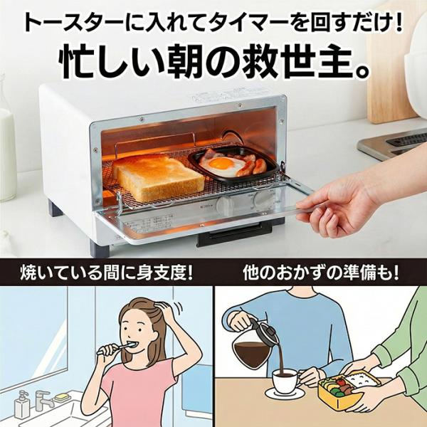フライパン不要で時短調理:トースターに入れるだけで目玉焼きやウインナーが手軽に作れて、忙しい朝にも大活躍。