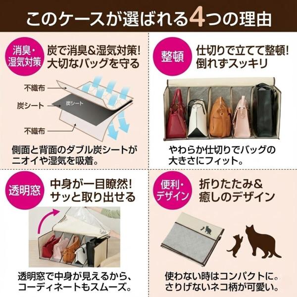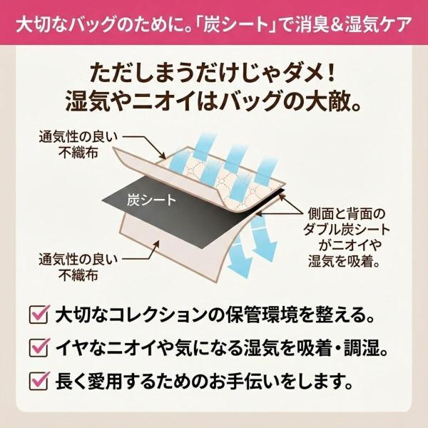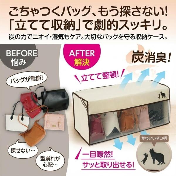 この《炭消臭 かばん収納ケース》は、バッグを立てて整頓できるだけでなく、炭シートで気になるニオイまでケア。