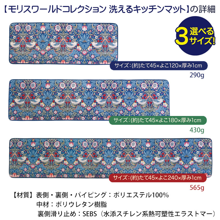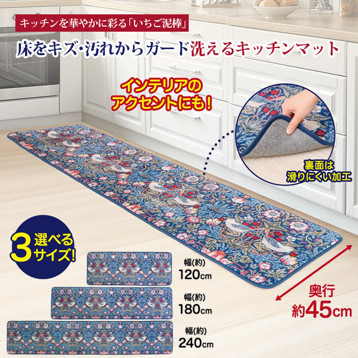 モリス キッチンマット 45×120 180 240cm 3サイズ 洗える ロング 台所 ラグ マット ズレにくい 滑り止め おしゃれ 可愛い ウィリアムモリス いちご泥棒 花柄