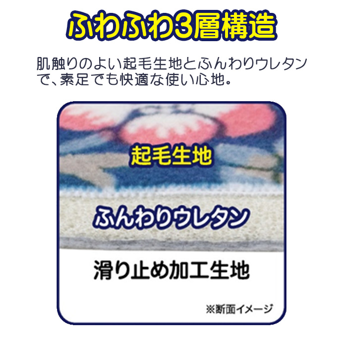 触れた瞬間に心地よさを感じるふんわり起毛生地とウレタン入りのクッション構造で、素足でも快適な使い心地。厚みは約1cmと薄型なので、キッチンの扉や引き出しの開閉にもストレスなく対応します。