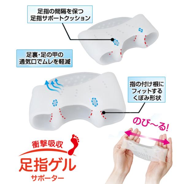 足指の間隔を広げて正しい位置へ導きながら、クッション性のあるゲル素材が圧力や摩擦から保護。
