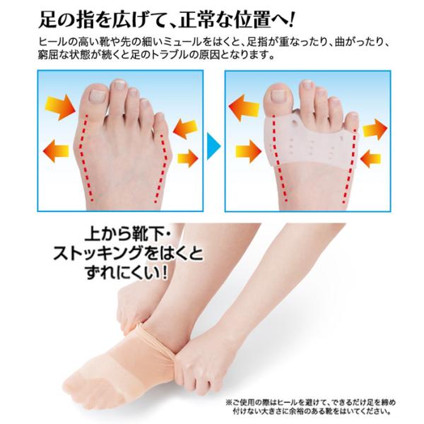 足指のズレ・重なりを防ぐ:足指を広げて正しい位置にサポート。ヒールやミュールでのトラブル予防にも◎