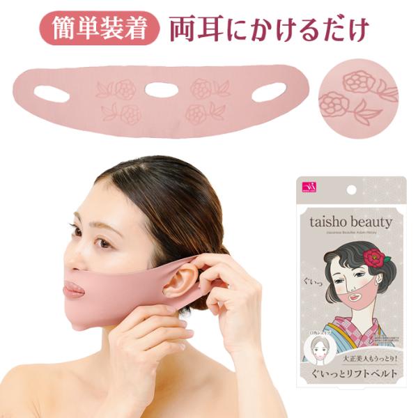 《大正美人 ぐいっとリフトベルト》は、内側のシリコンプリントが気になる口まわりにピタッと密着し、ぐいっと引き上げてサポート。
