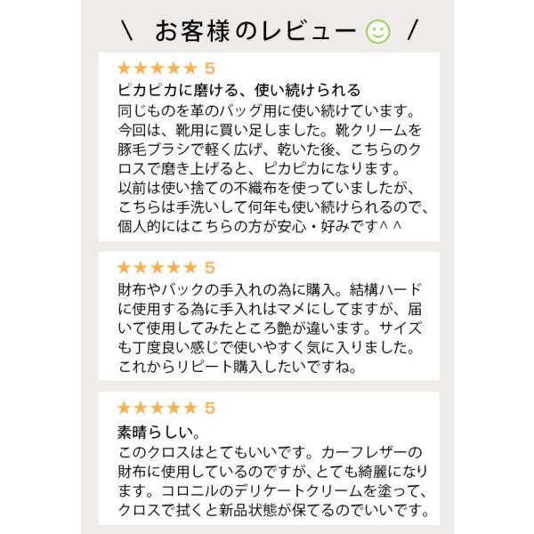 靴やバッグをはじめとしたレザー製品一般のお手入れ用・靴用・バッグ用・ソファー用など用途に合わせて枚数を揃えておくと、大変便利です。