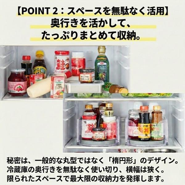 これにより、冷蔵庫の角や奥行きを最大限に利用しながらも、