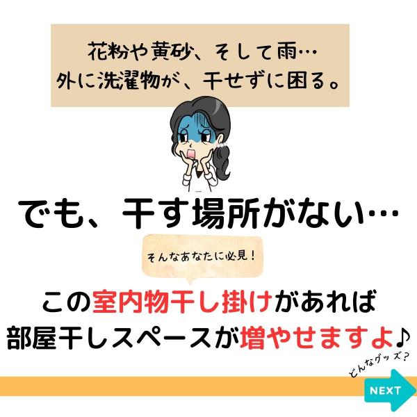 部屋干しが多くなる梅雨の時期や花粉の時期におすすめの室内物干しフックです。