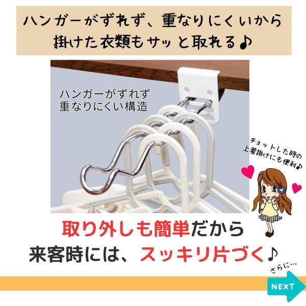ハンガーがズレない溝つき、2つ使うことで、物干しざお(パイプ直径32mm以下)をしっかりキャッチしてくれます。