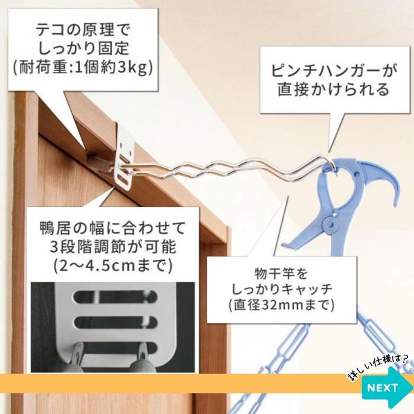 鴨居(かもい)やふすま枠、扉枠・窓枠に、引っ掛けるだけで、物干し竿フックに早変わり!!人気の室内干しグッズ。