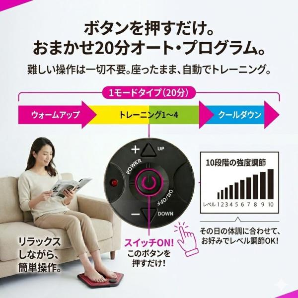 電源を入れ、20分オートトレーニング ボタンを押すだけで簡単スタート!