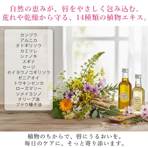 唇の荒れ・乾燥をケア:14種類の植物エキス配合で、荒れやカサつきを予防しながらやさしく保湿します。