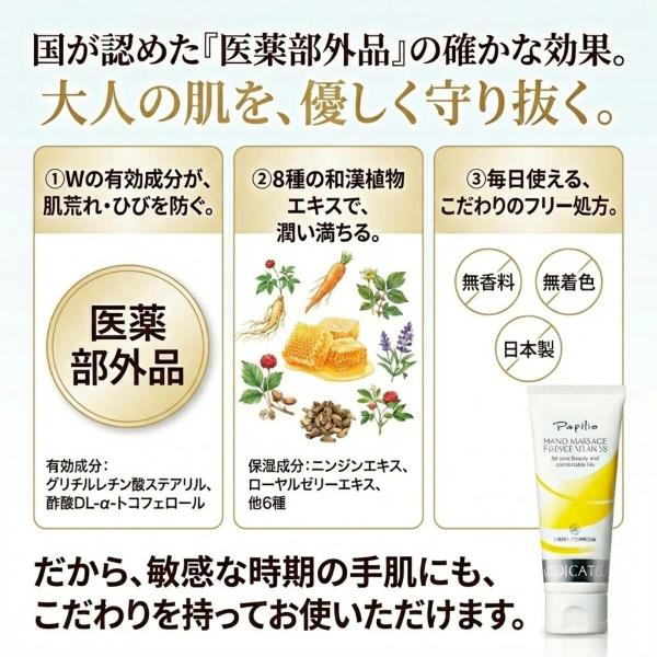 パピリオハンドクリームは、8種類の和漢植物エキスをメルティスクラブに凝縮し、配合した薬用ハンドマッサージクリームです。