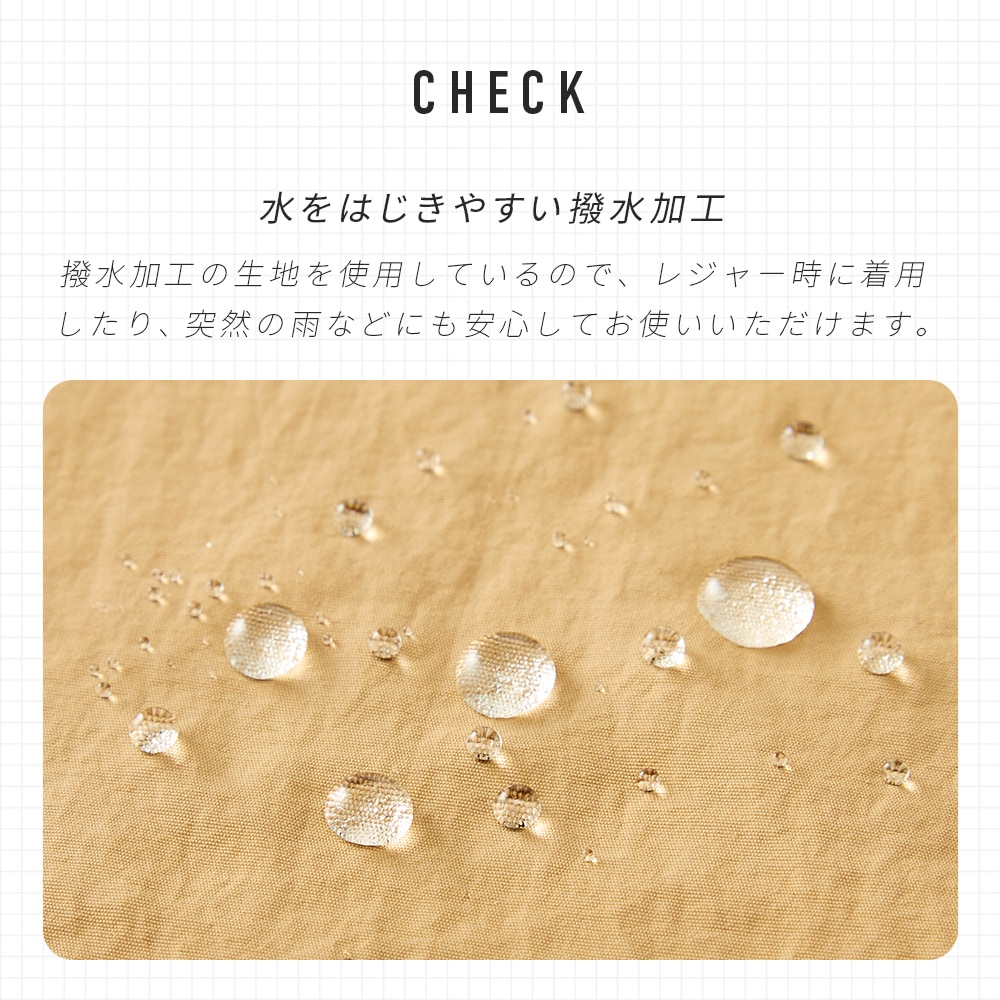 水をはじきやすい撥水加工。内側はムレにくいメッシュ生地を使用。