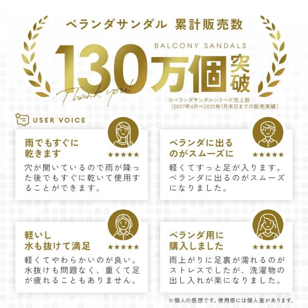 軽量で柔らかなEVA素材だから、長時間履いてもラクチン。ベランダ用に限らず、庭やバスルームでも活躍します。